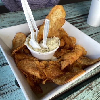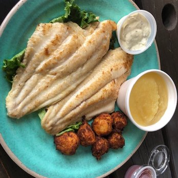 Lightly breaded flounder served with fries